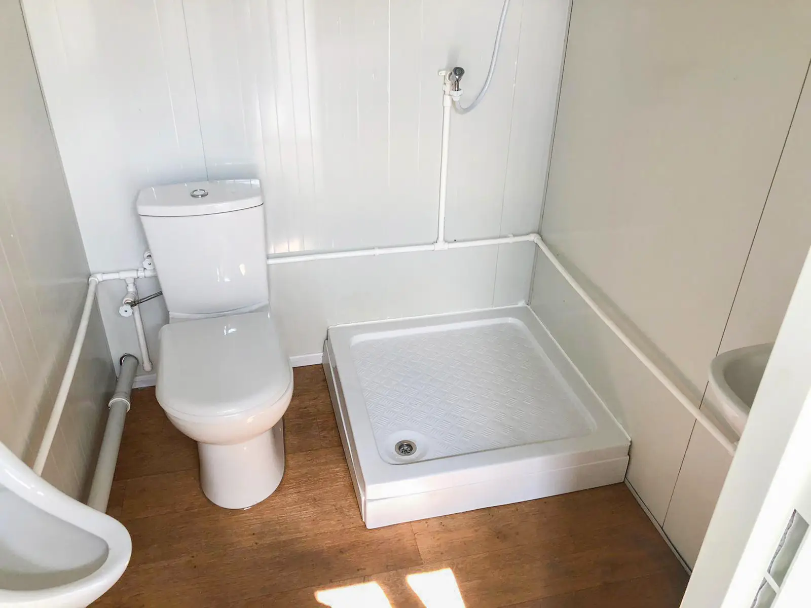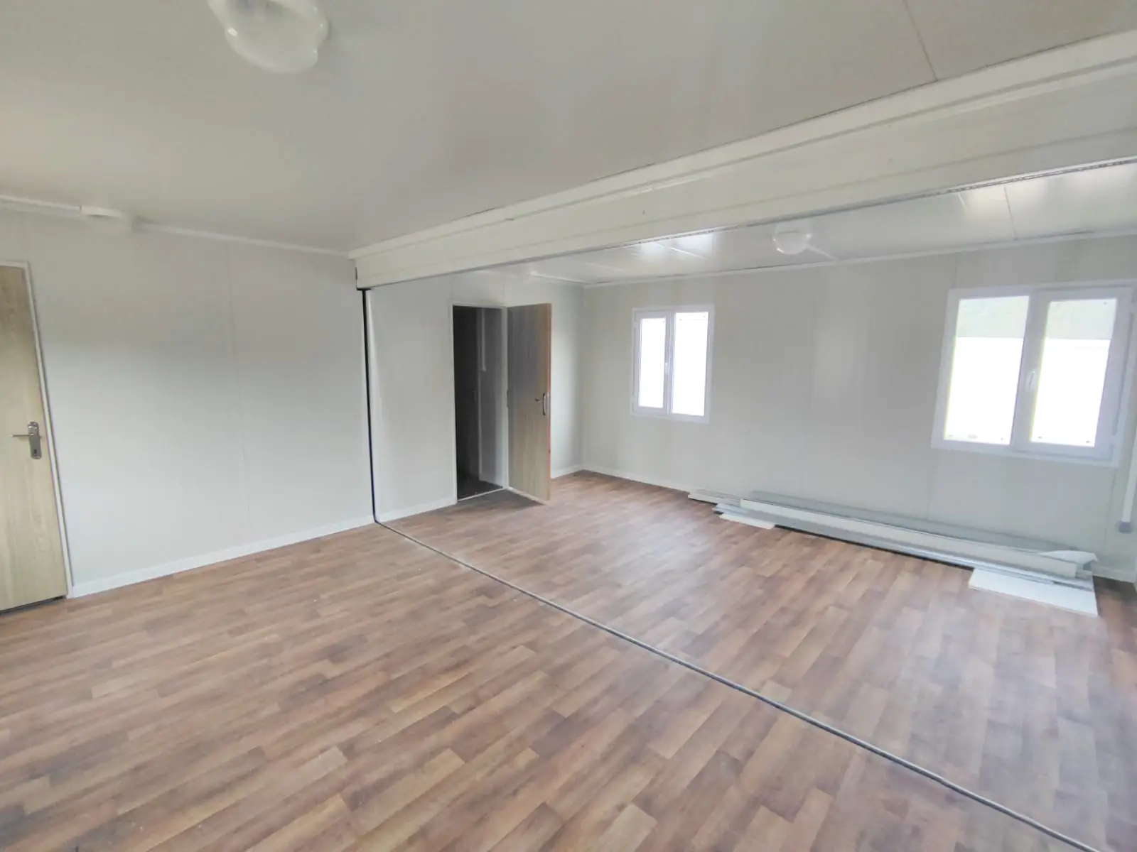 2x chambre, 1x porte d’entrée, 1x porte intérieure, 4x fenêtre, 1x toilette avec lavabos, 1x douche, 1x cuisine
