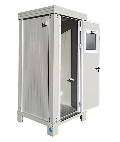 Le bloc sanitaire S1 est constitué d’une ossature en acier galvanisé et laqué couleur gris clair RAL 9002.