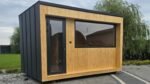 Sauna indépendant avec un espace de détente. Il présente un design industriel simple associé à du bois naturel. Le sauna est en bois d’épicéa et dispose d’un poêle électrique intégré. Il repose sur une structure en acier. C’est un bâtiment utilisable toute l’année. Il ne nécessite qu’un raccordement à l’électricité et des fondations élémentaires.