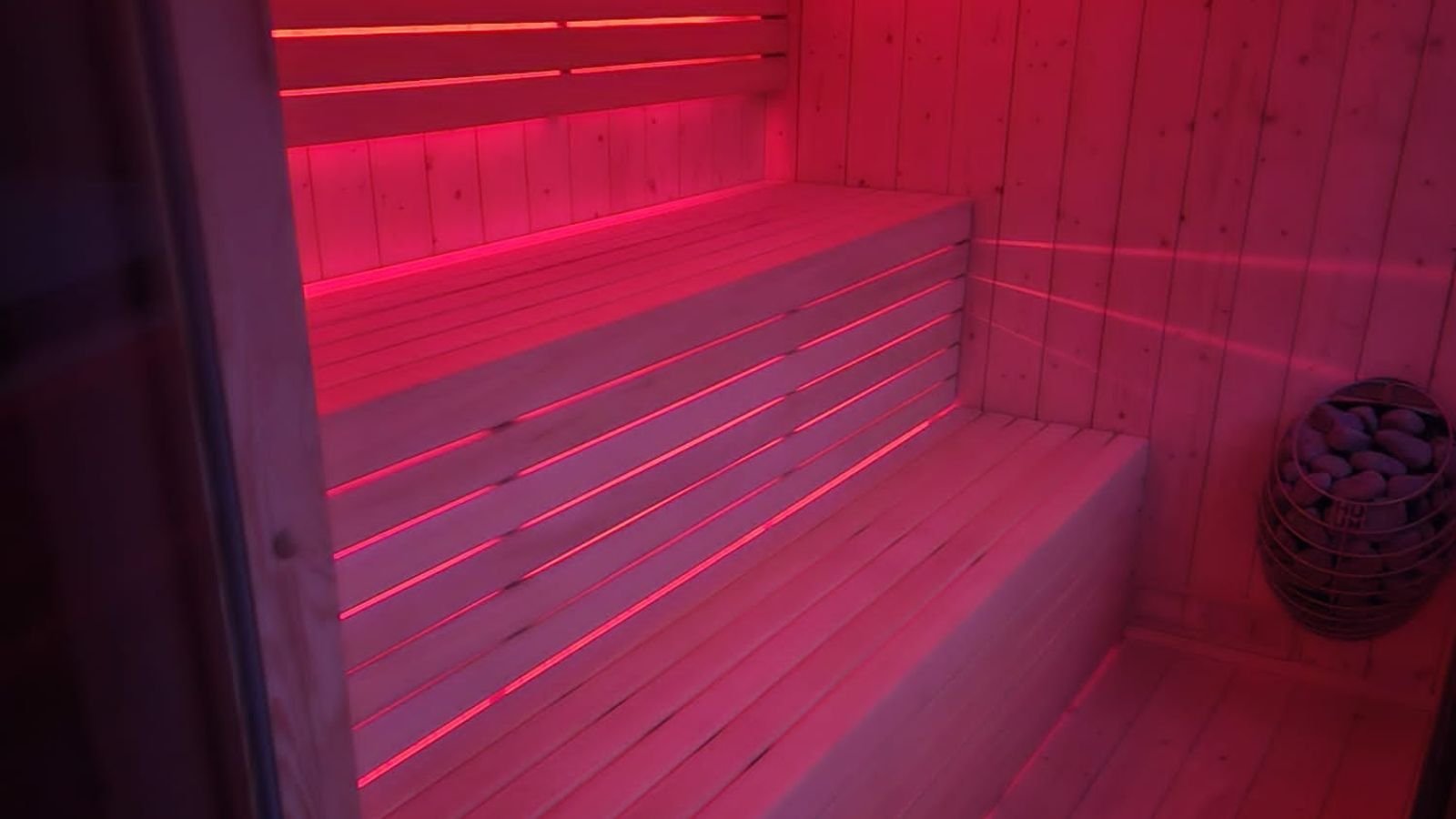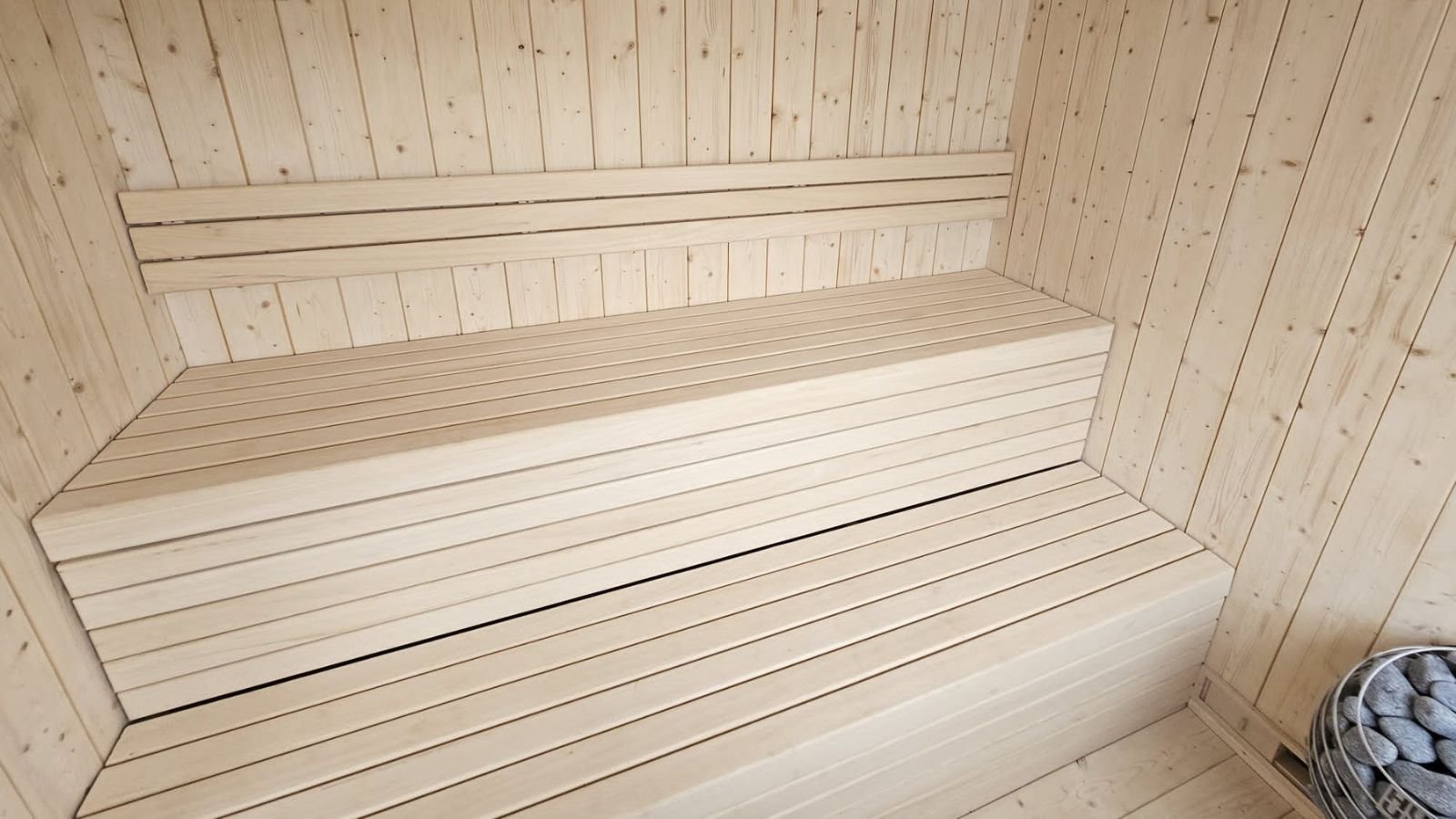 - Sauna : Revêtement en bois d’épicéa, bancs en bois d’Abachi, verre trempé